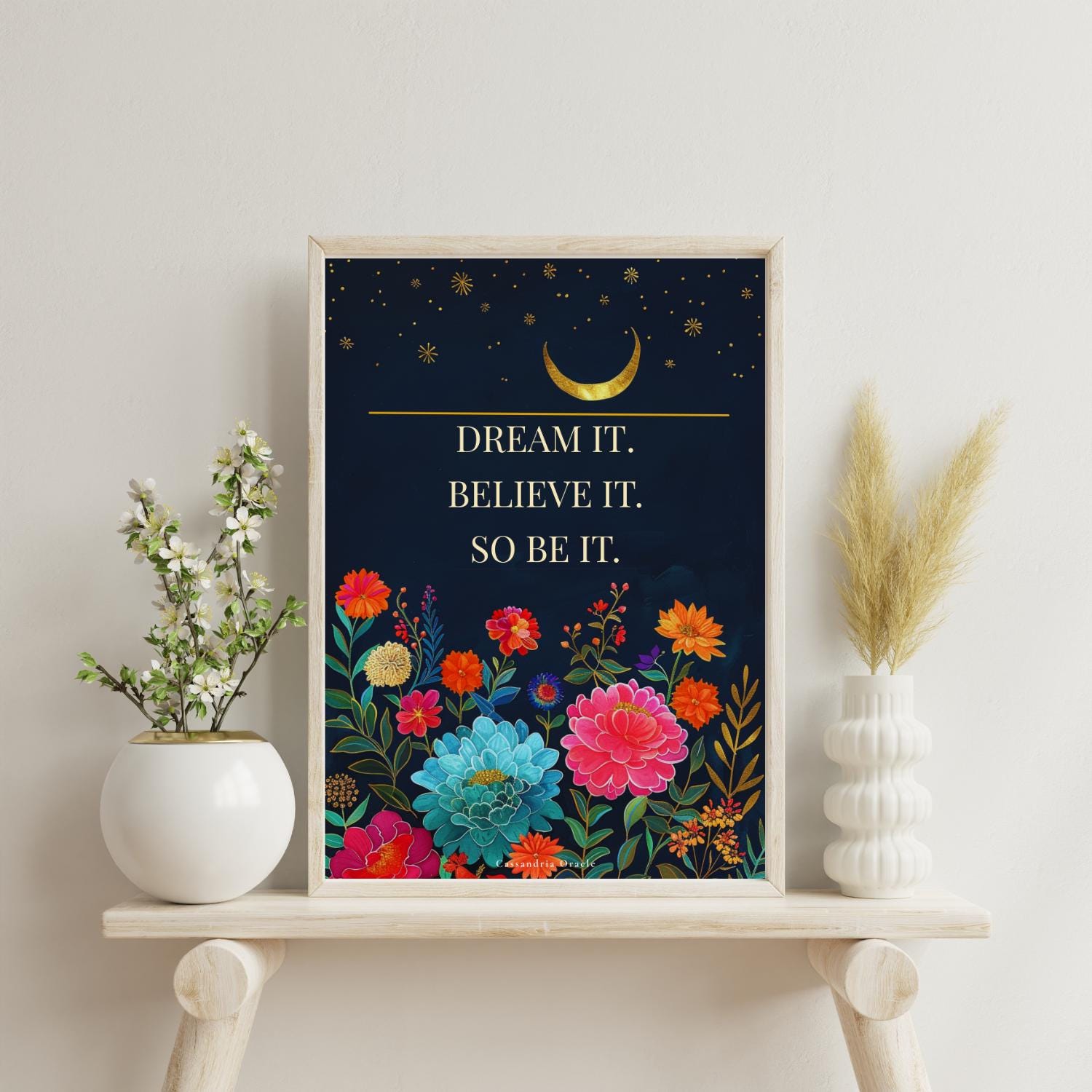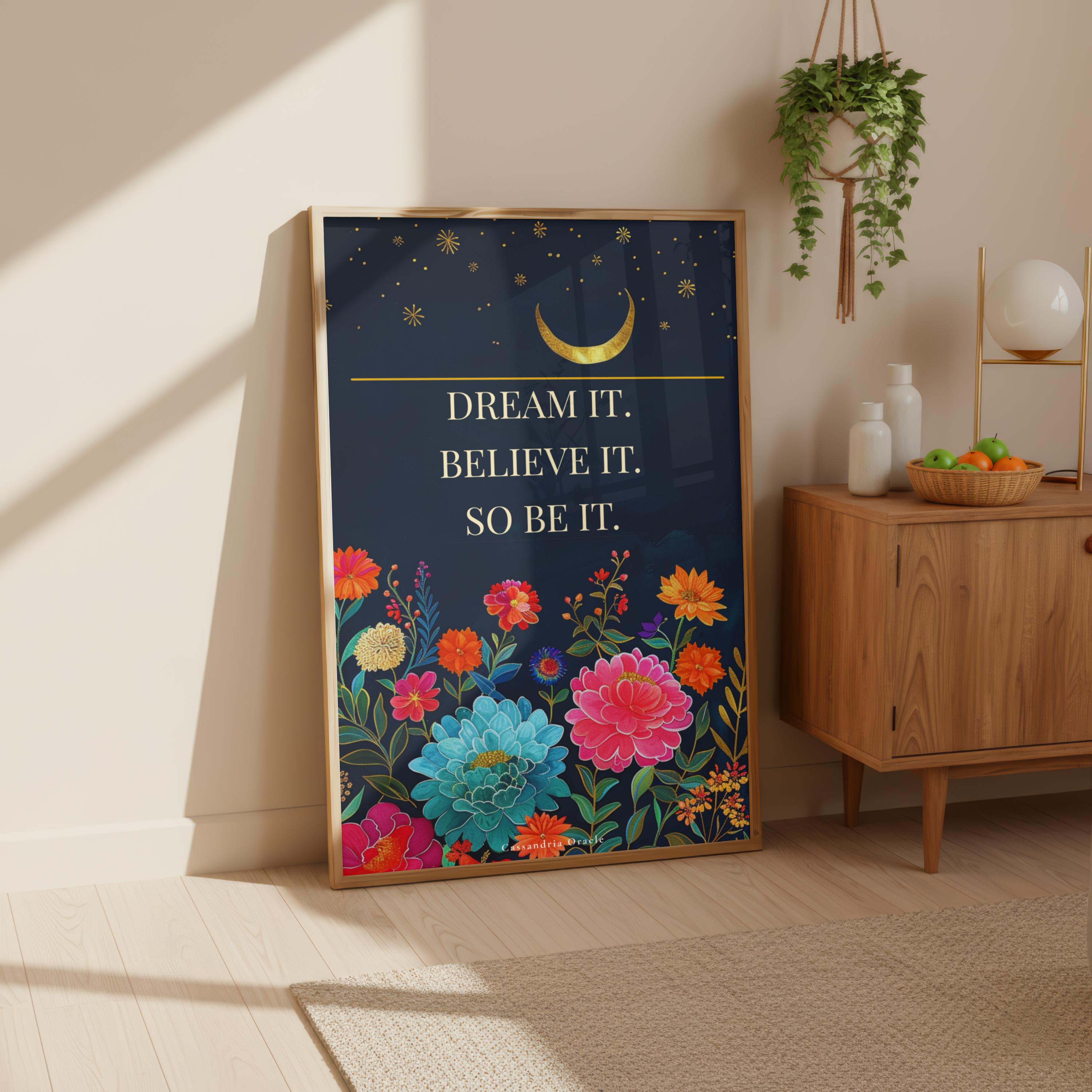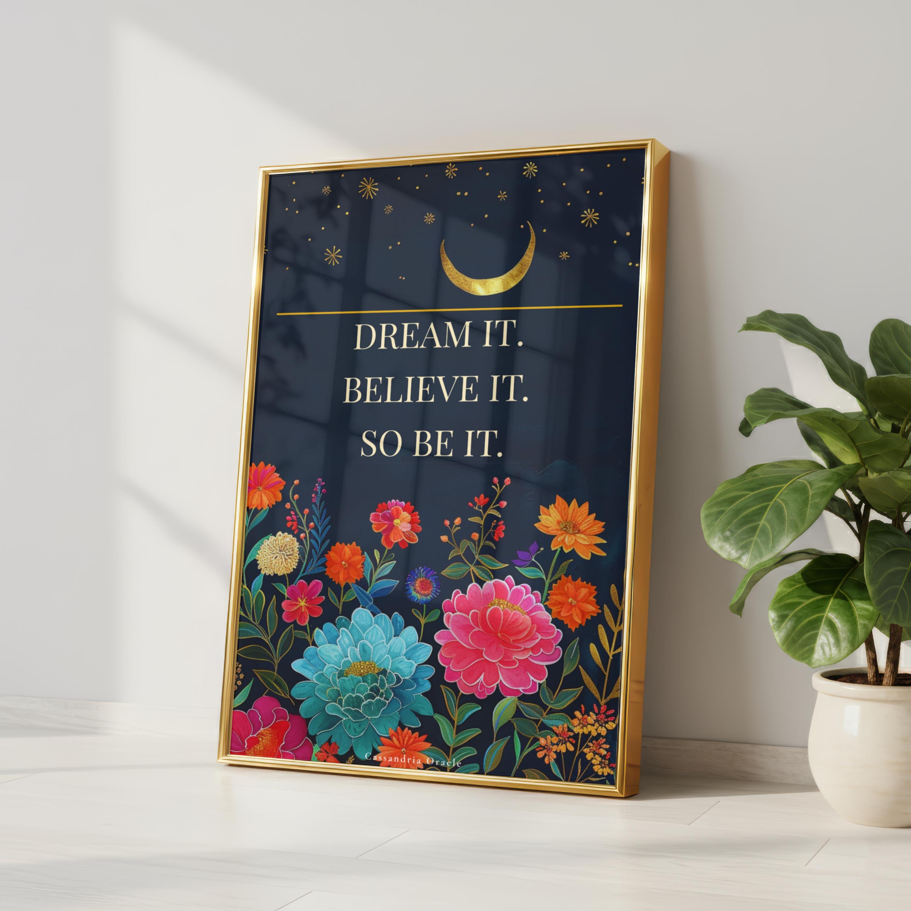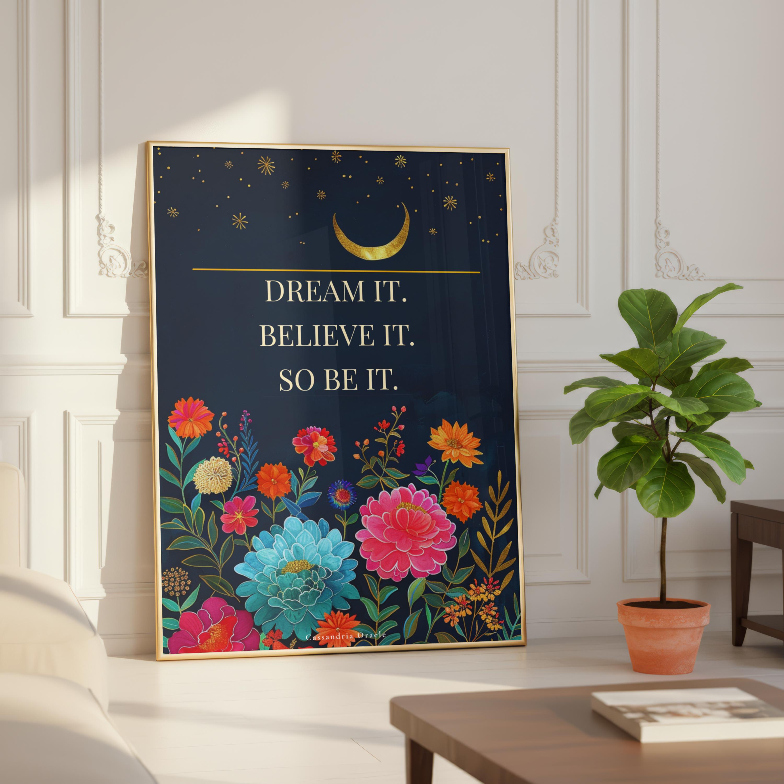 Bring intention and magic into your space with this stunning floral quote print. Set against a deep navy night sky with a glowing gold crescent moon and scattered stars, this bold empowerment print is the perfect reminder to dream big and trust the journey.