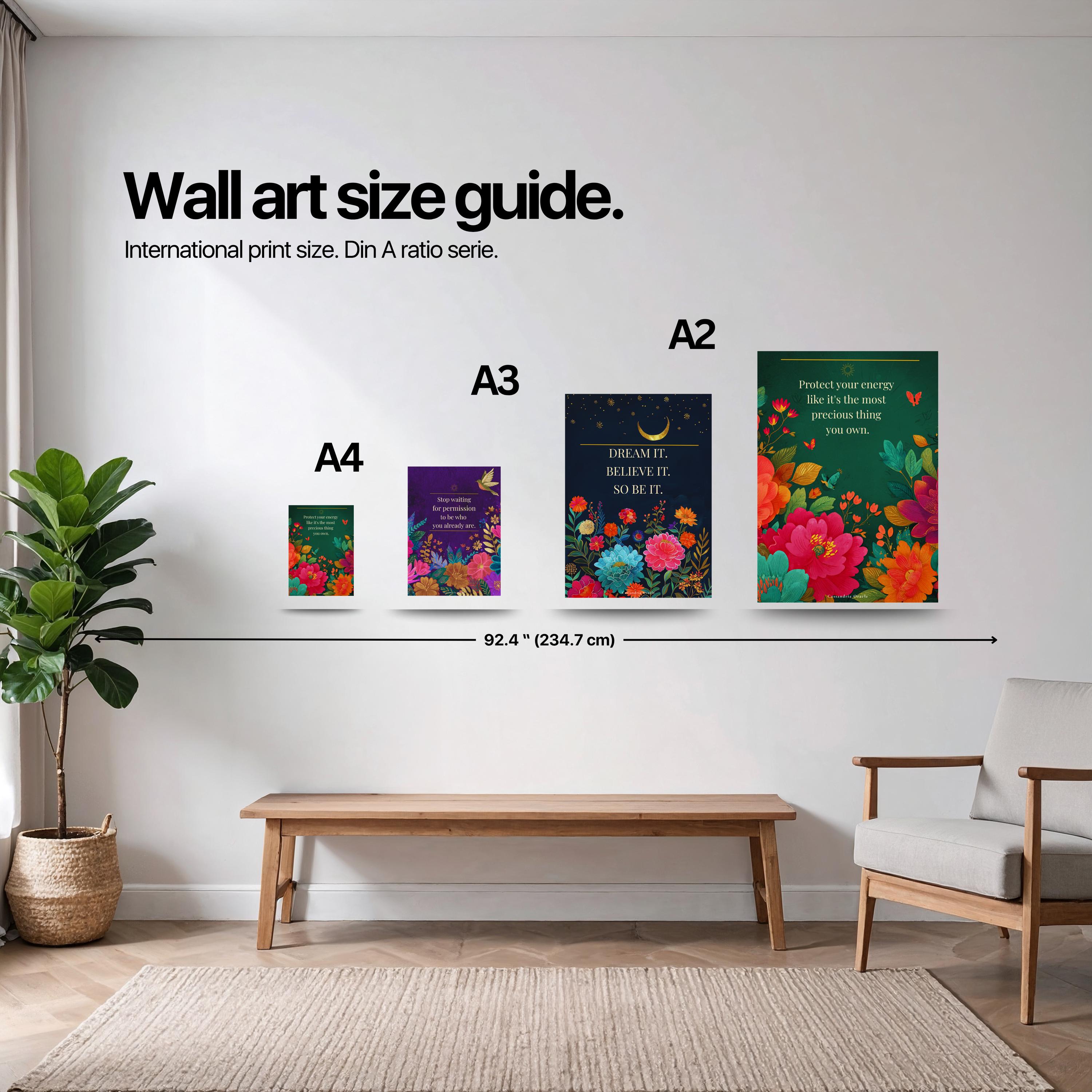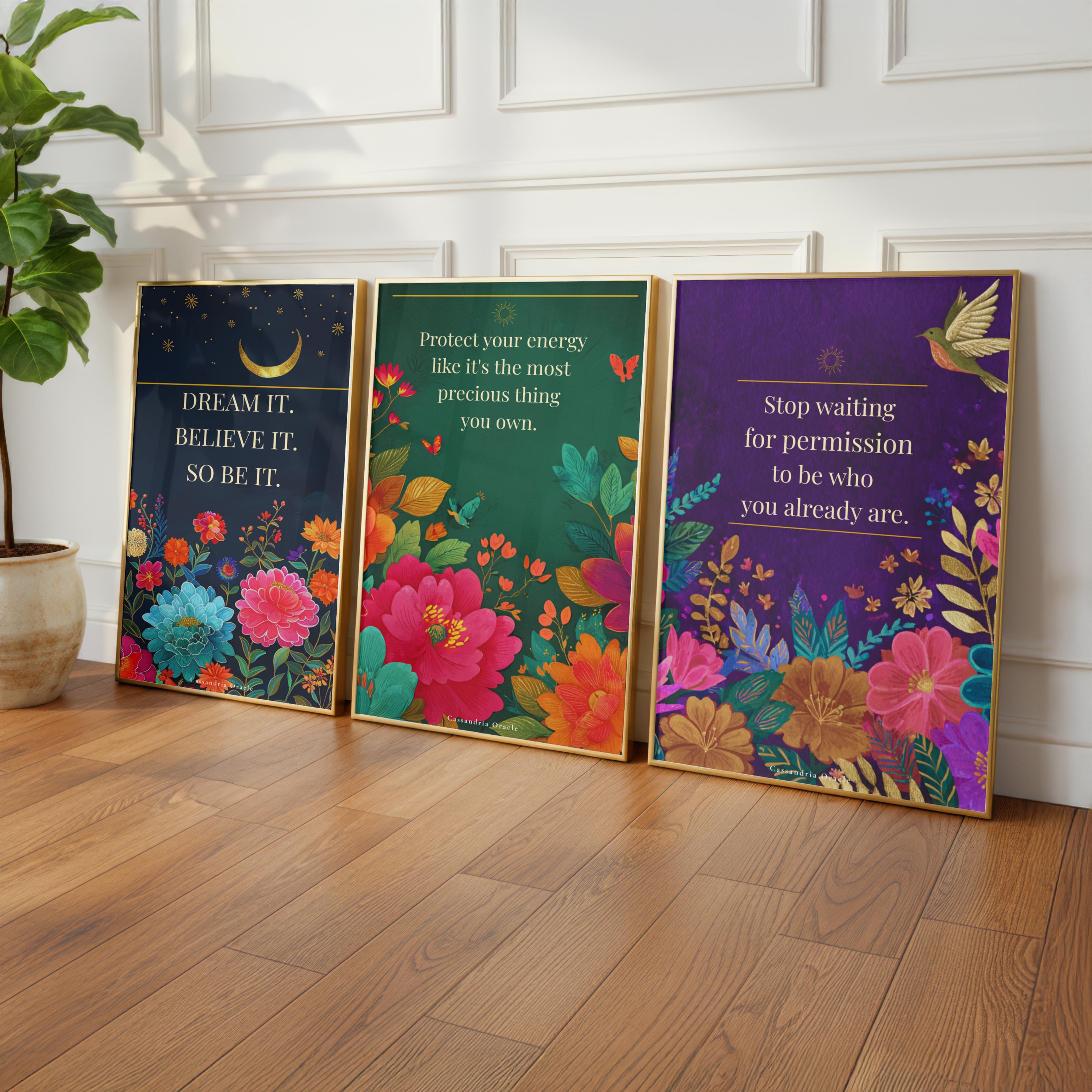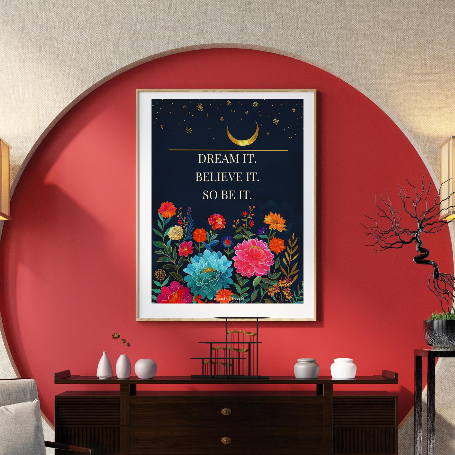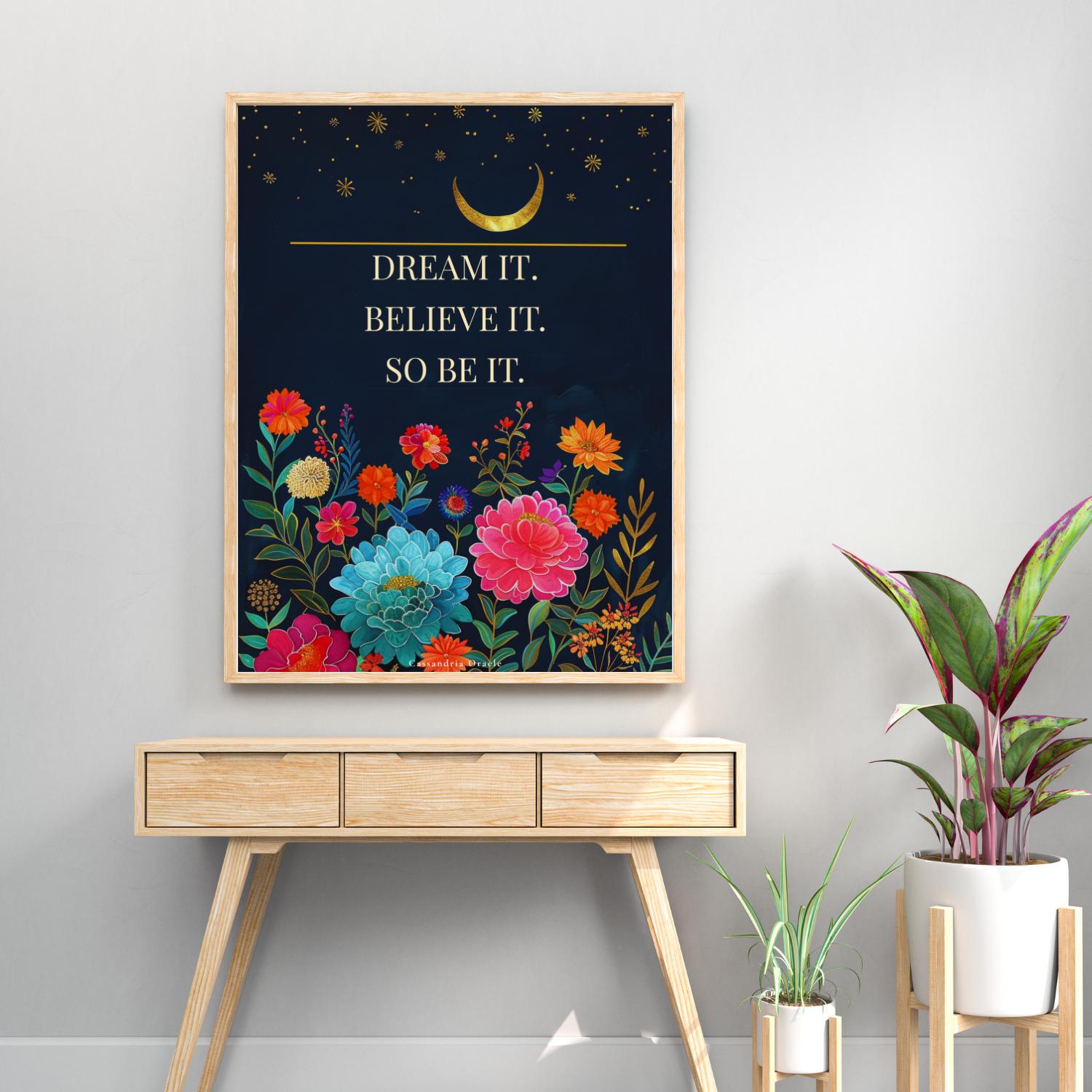 Bring intention and magic into your space with this stunning floral quote print. Set against a deep navy night sky with a glowing gold crescent moon and scattered stars, this bold empowerment print is the perfect reminder to dream big and trust the journey.