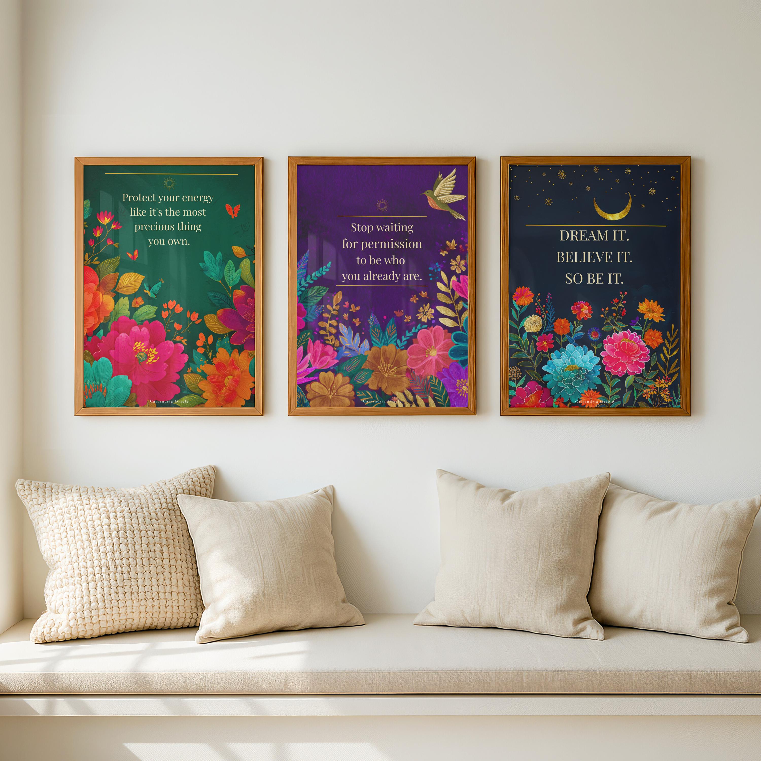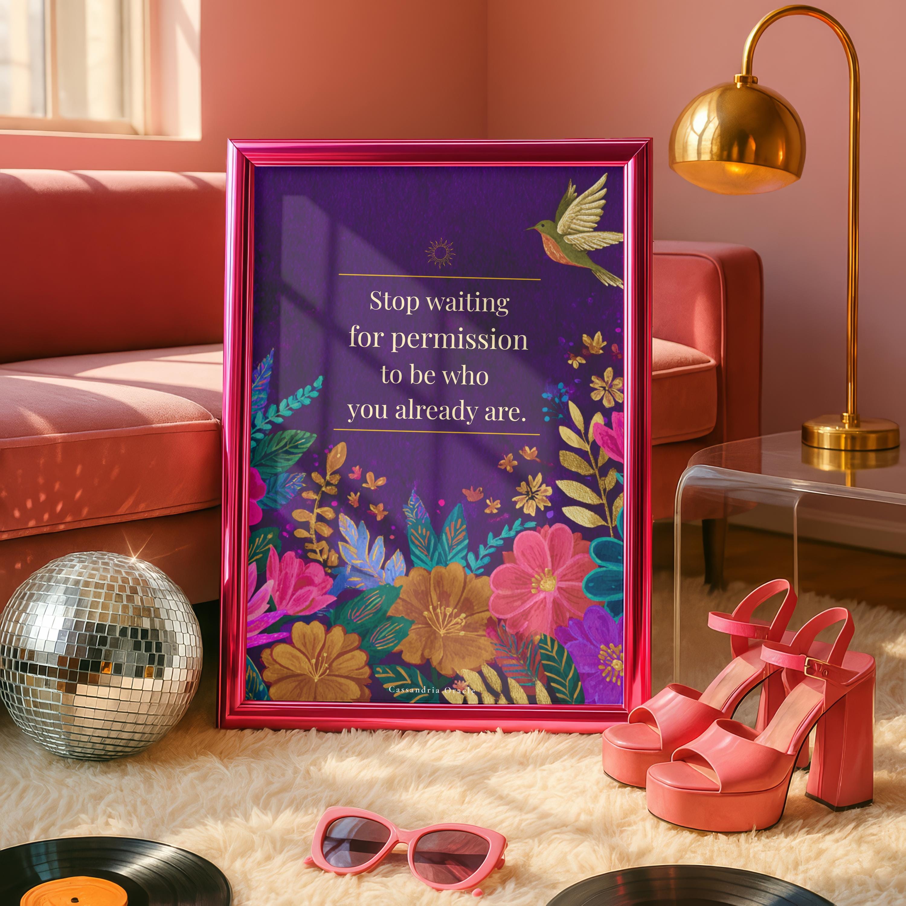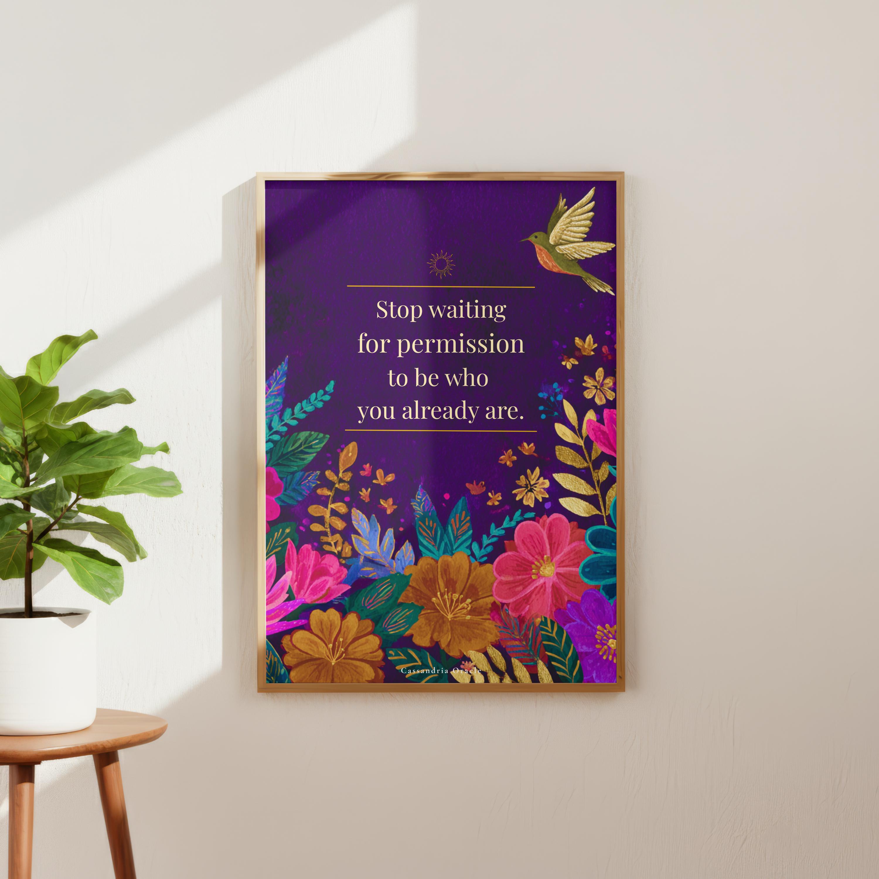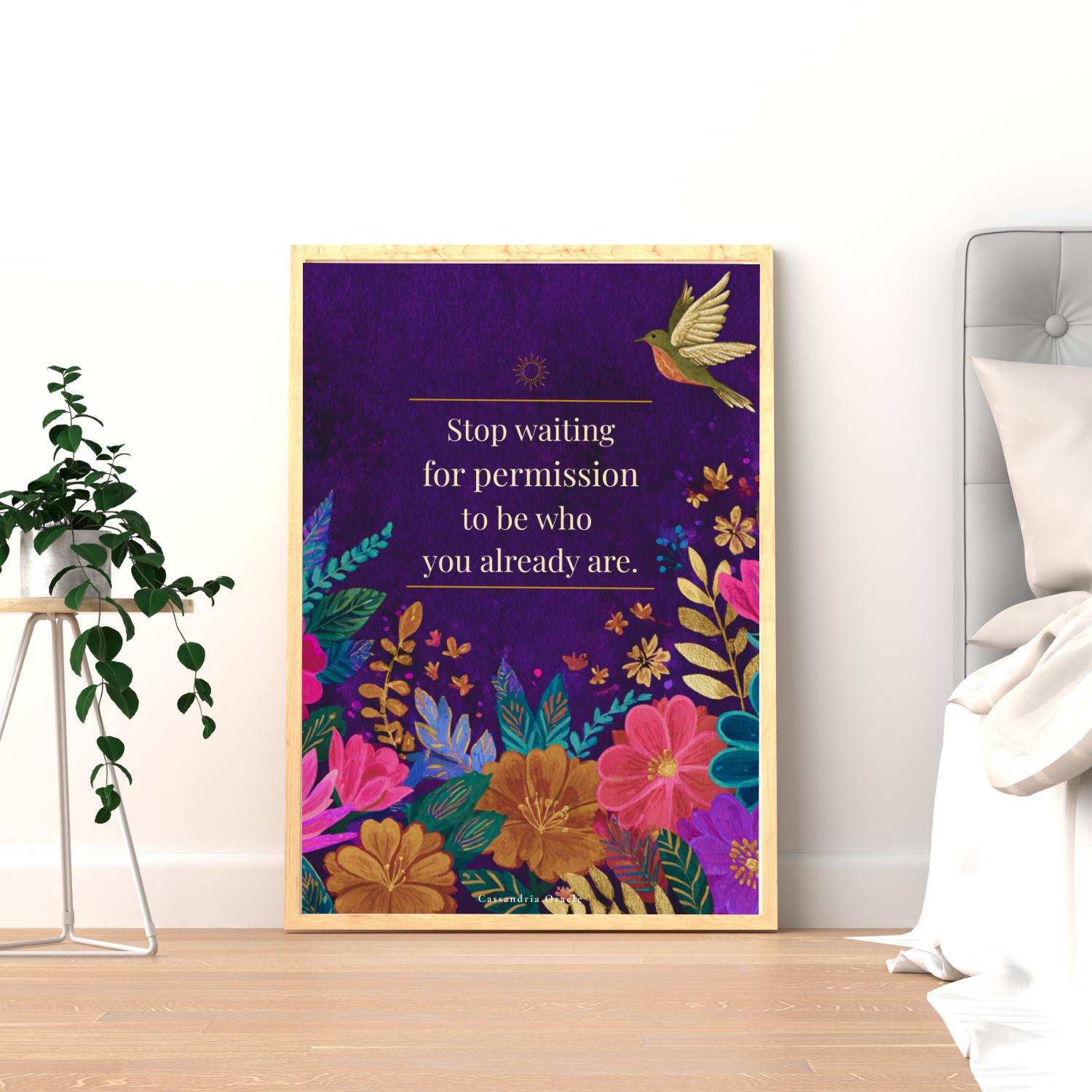 A powerful reminder to stop seeking approval and start living as your most authentic self. This stunning deep plum floral print features a gold bird in flight — a symbol of freedom and courage — surrounded by vibrant jewel-toned blooms.