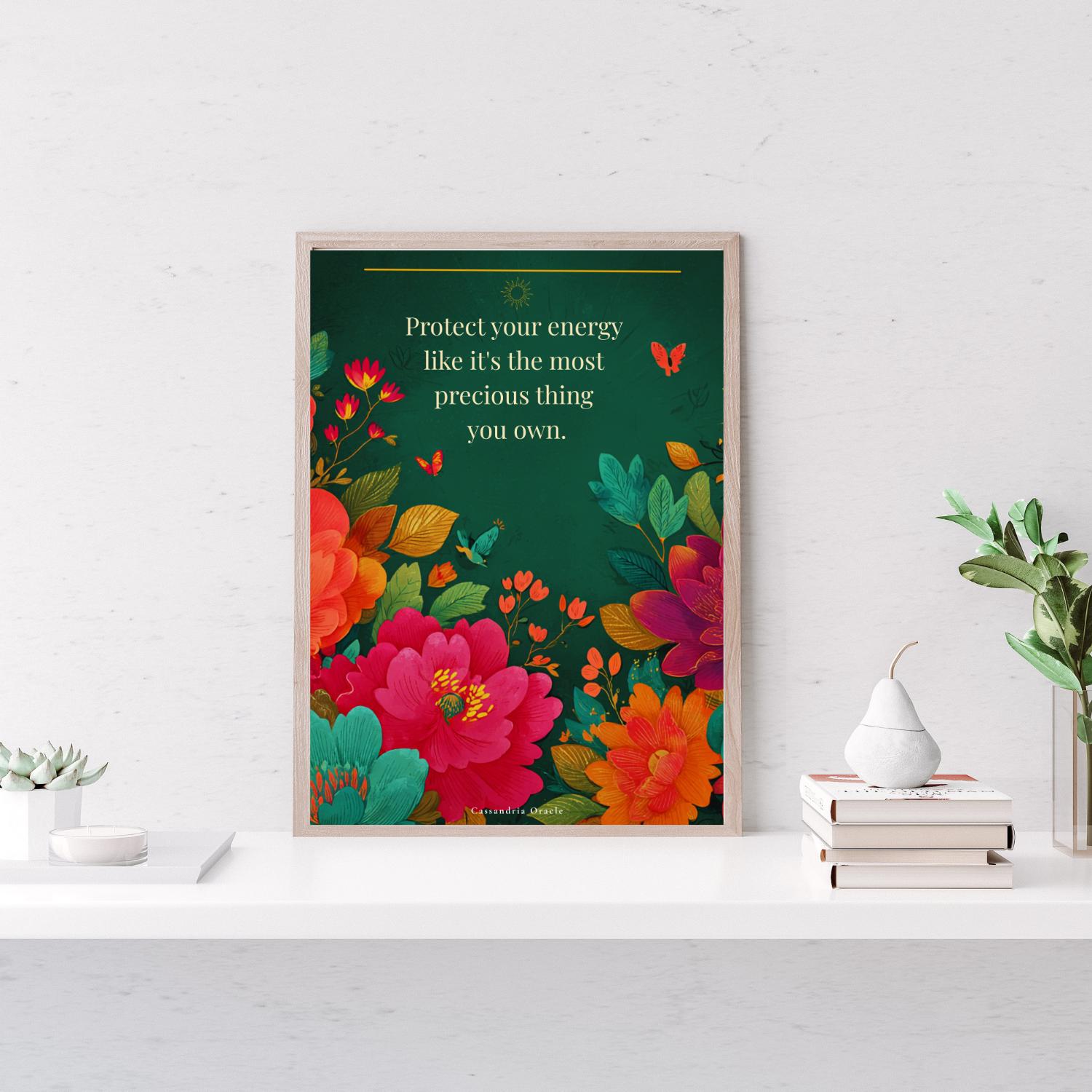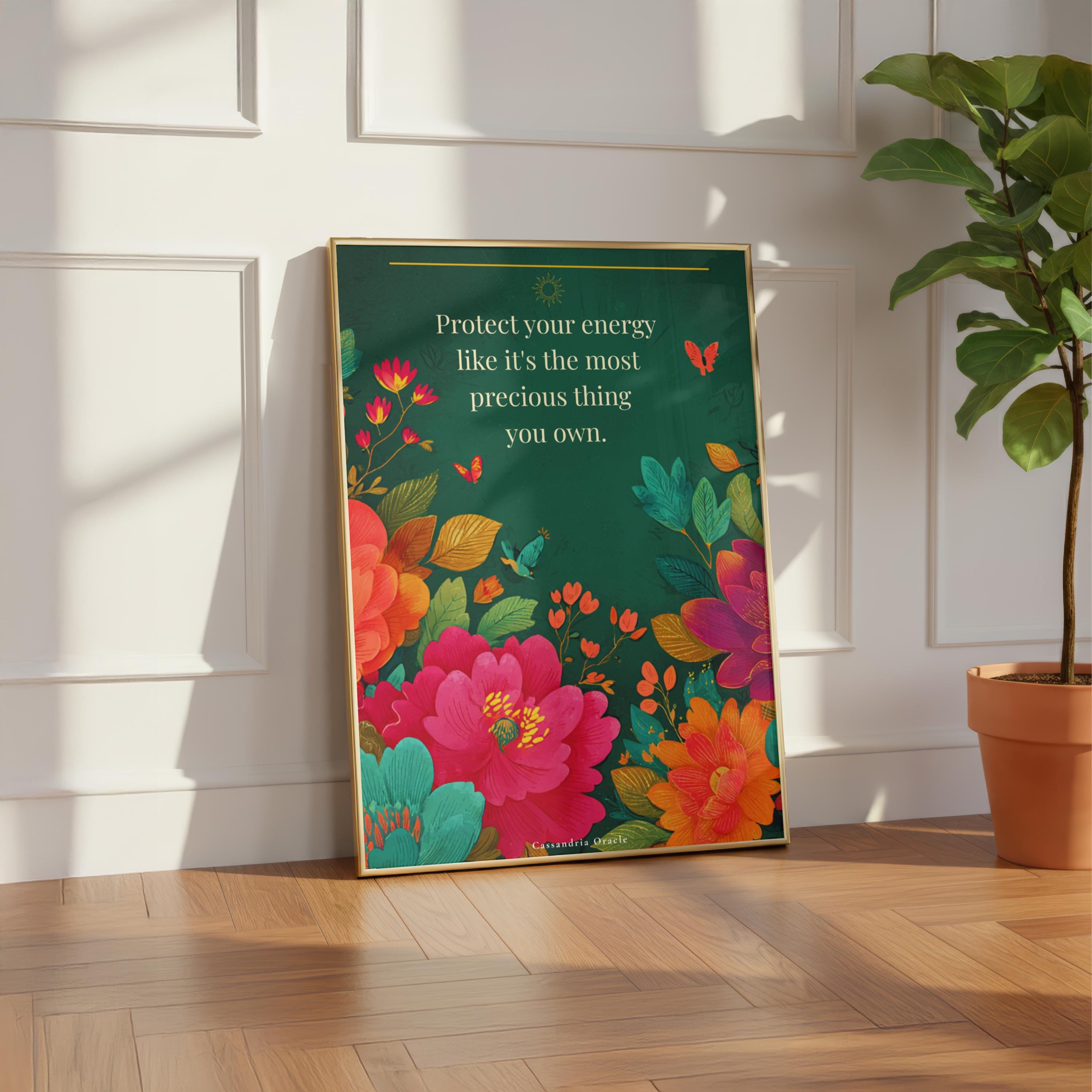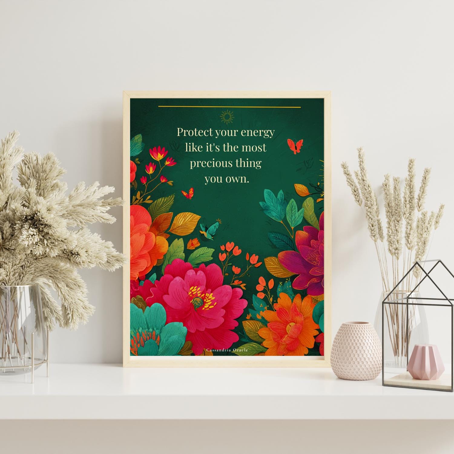 Your energy is sacred. This rich forest green floral print with a delicate gold sun motif is a daily reminder to guard your peace and pour into yourself first. Bold, beautiful and deeply meaningful — perfect for a bedroom, office or meditation space.
