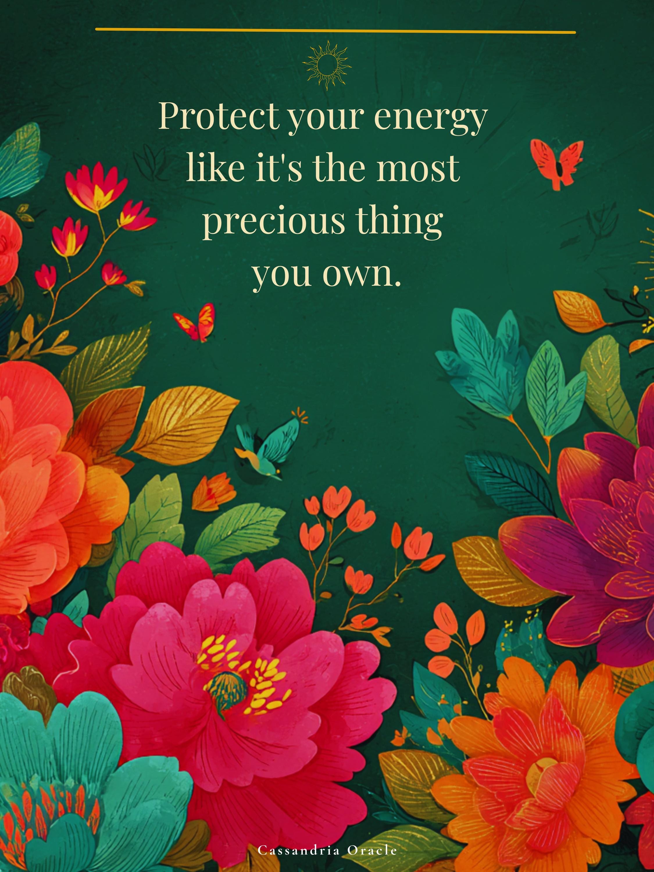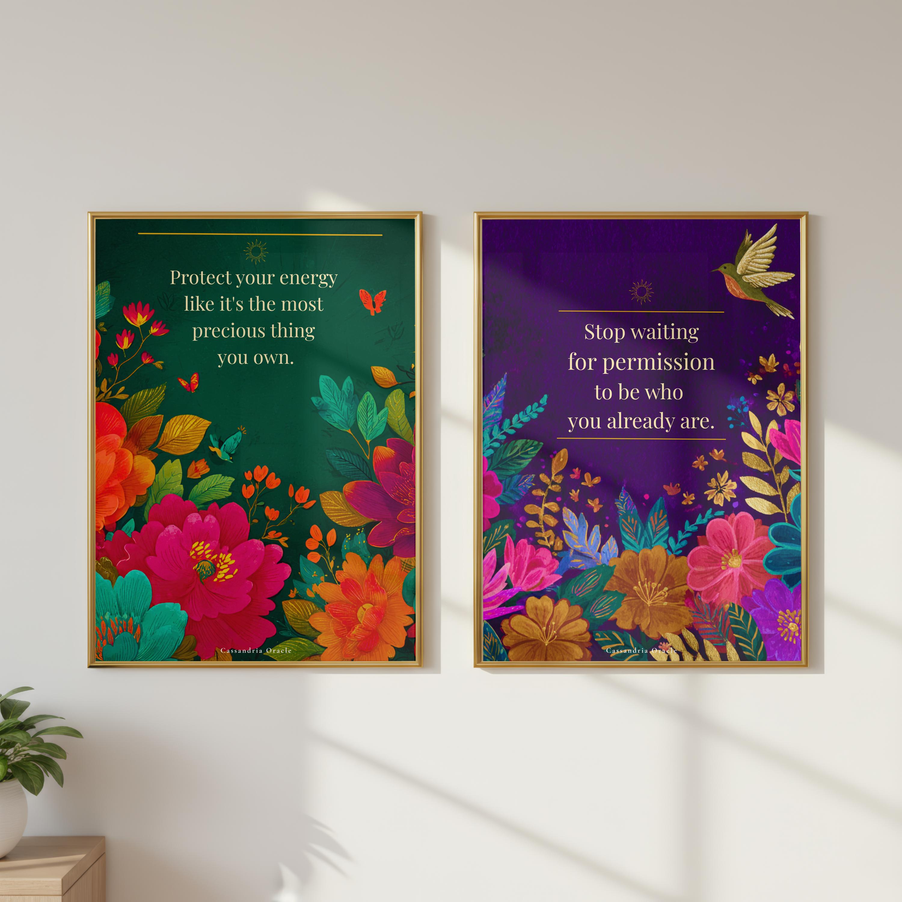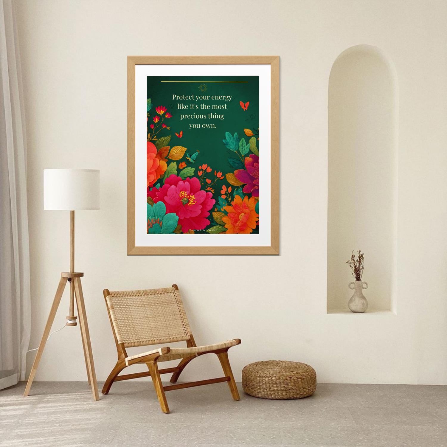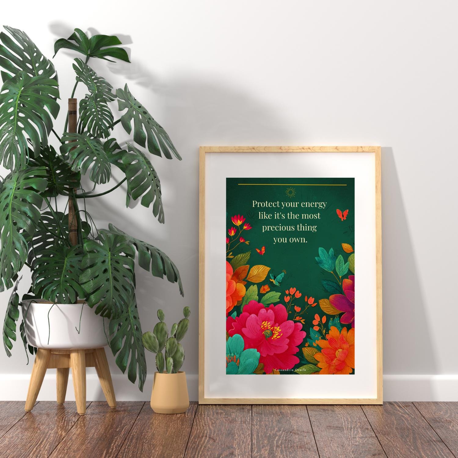 Your energy is sacred. This rich forest green floral print with a delicate gold sun motif is a daily reminder to guard your peace and pour into yourself first. Bold, beautiful and deeply meaningful — perfect for a bedroom, office or meditation space.